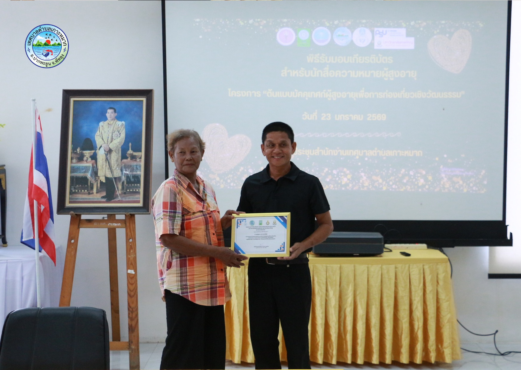 มอบหมายให้นายวินัย หนูชู รองปลัดเทศบาล มอบเกียรติบัตรผู้ผ่านการอบรม ในโครงการต้นแบบมัคคุเทศน์