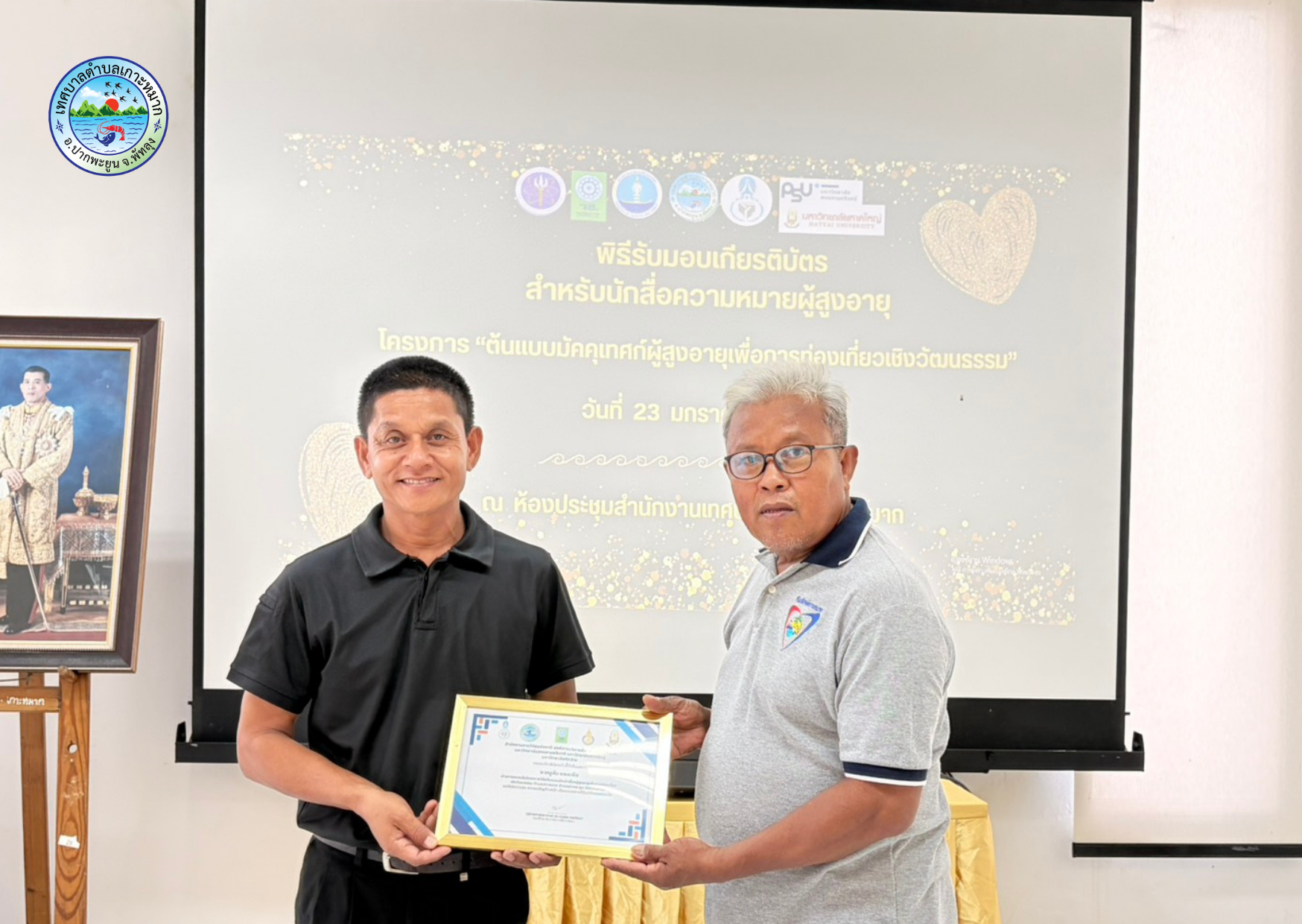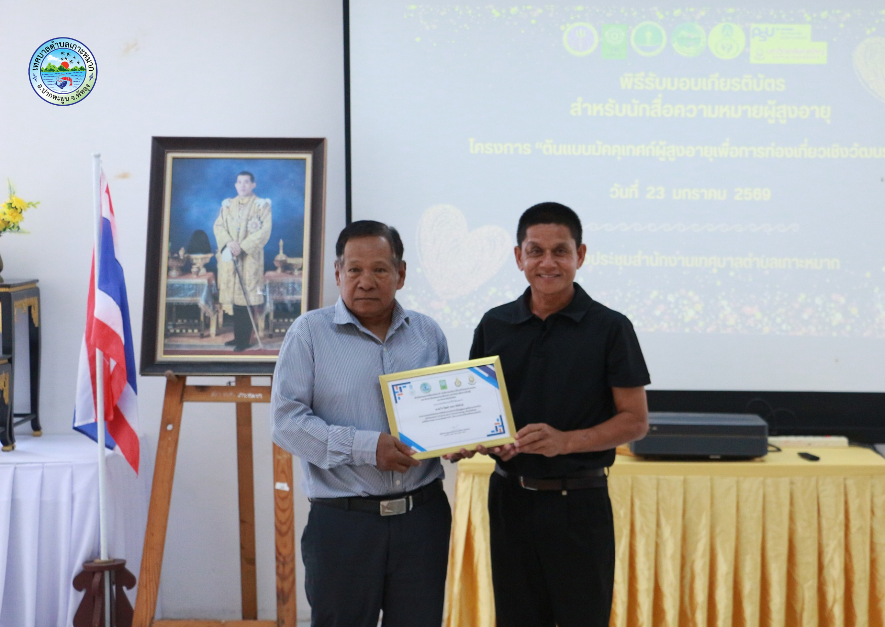มอบหมายให้นายวินัย หนูชู รองปลัดเทศบาล มอบเกียรติบัตรผู้ผ่านการอบรม ในโครงการต้นแบบมัคคุเทศน์